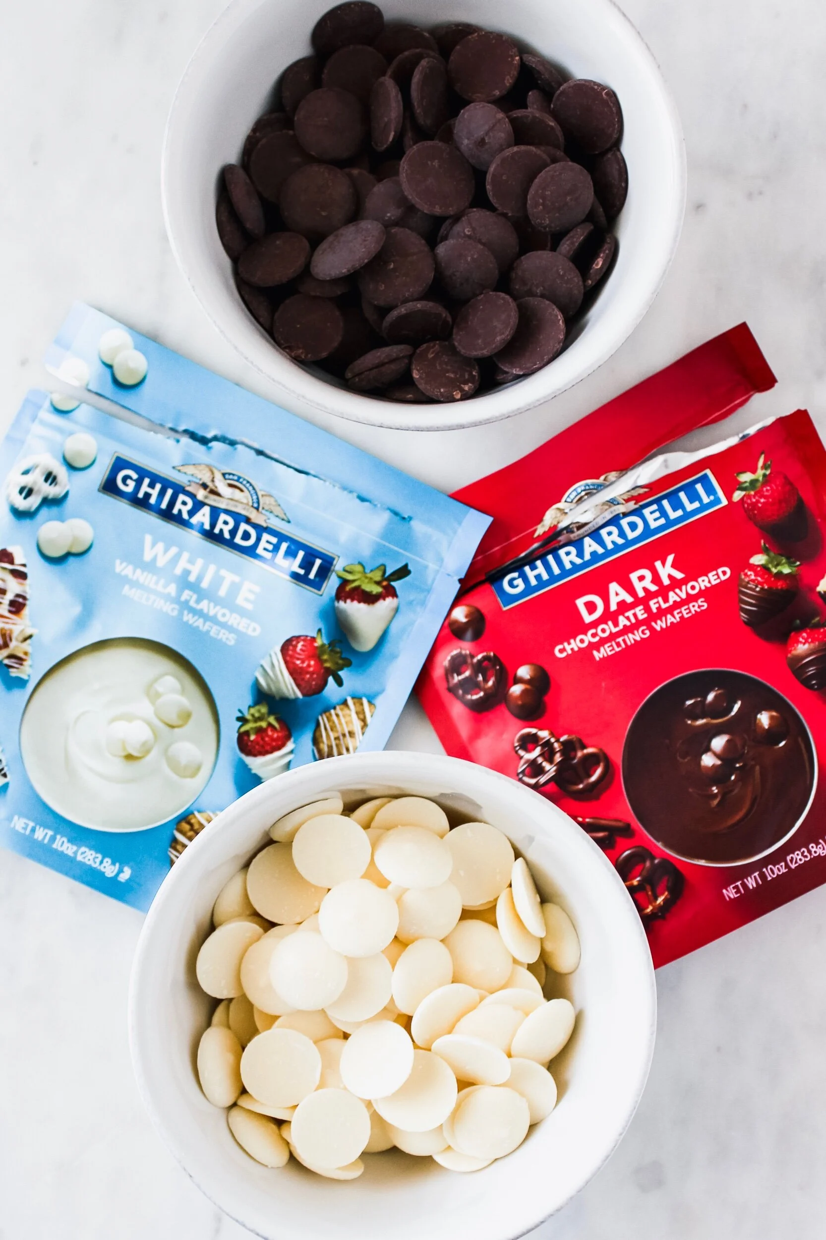 I prefer to use melting chocolates vs. chocolate chips to make this recipe as easy as possible (melting wafers create a smooth texture, don’t require a double-broiler, and dry really fast). Most grocery stores carry the Ghirardelli melting wafers, but I always buy them at Target or Walmart because they have the best pricing. You can also order them online here - dark chocolate, white chocolate.
